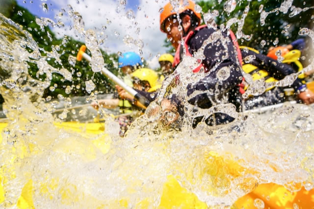 ラフティングは、ボートに乗って急流を下る人気のアクティビティ。